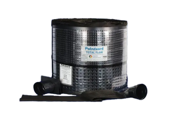 Prefabricated, tapered, high-capacity sheet molded Totalflow™ perimeter drainage panel, constructed using a formed polystyrene core, transitions the water collected from Polyflow® 10 to an outlet drain. The Totalflow™ ¼-inch wide top meets the Polyflow® 10, tapering to 1-inch wide at the bottom. The tapered design allows more water to move away from the structure and into the drain. Totalflow™ rests on the waterproofed footer as the first component of the Polyguard® drainage system.