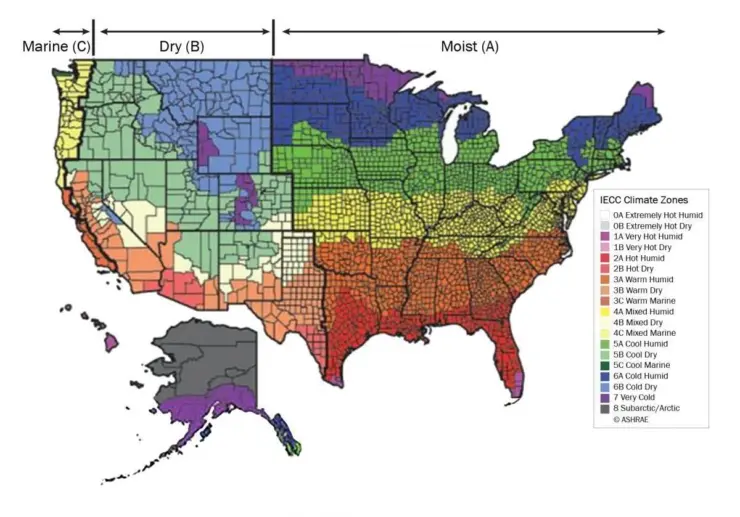 The 2021 International Residential Code R702.7 and the 2021 International Building Code 1404.3 mandate using Class I or II vapor retarders inside framed walls in climate zones 5, 6, 7, 8, and Marine 4. Southern, warmer climate zones (1, 2, and 3) do not need vapor barriers and retarders.