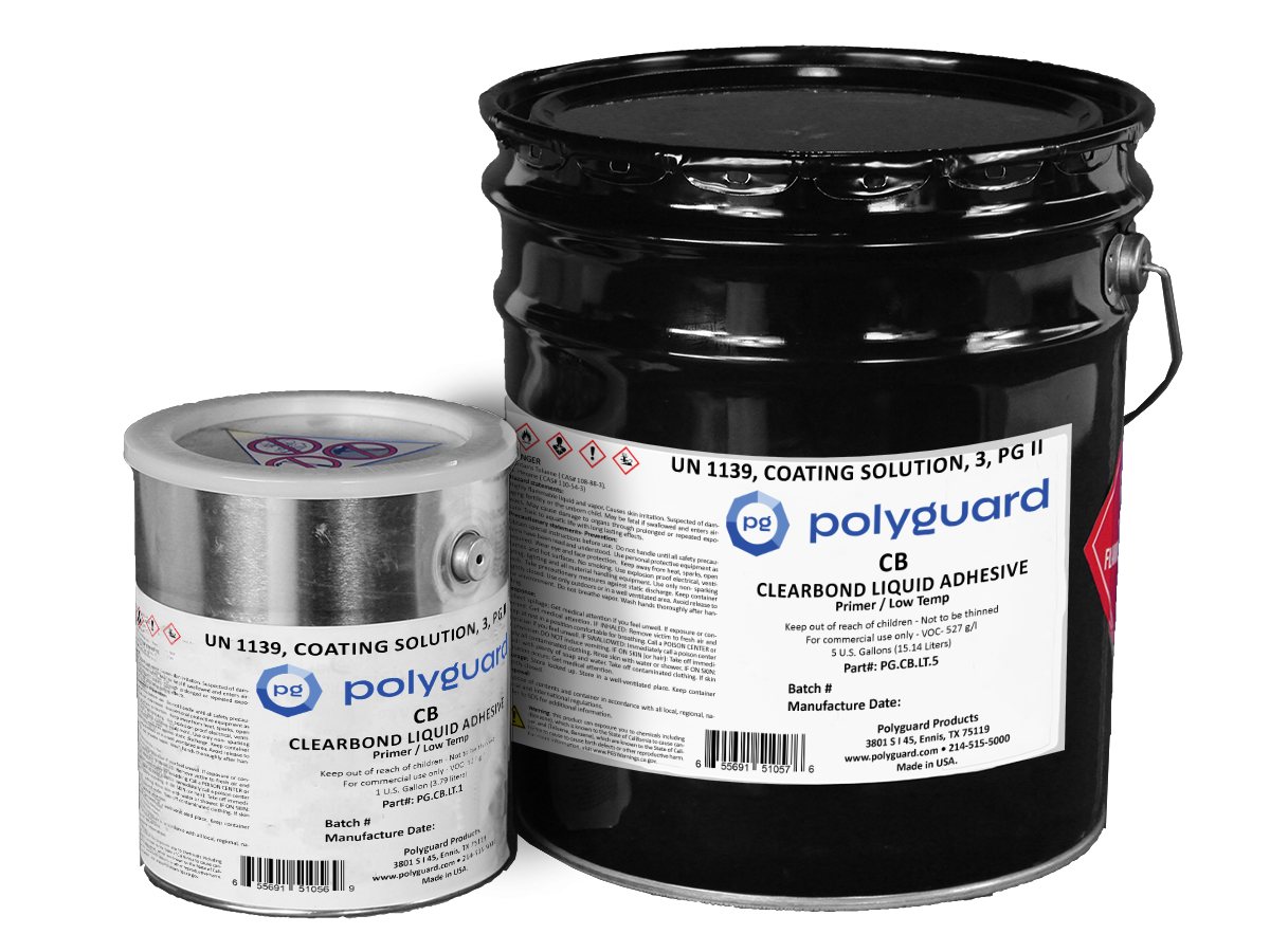 CLEARBOND LIQUID ADHESIVE is a rubber based adhesive in solvent solution formulated to improve adhesion of Polyguard construction flashing tapes, below-grade sheet waterproofing membranes, and above-grade sheet air barrier membranes. It is specifically suited for use in cool weather when rubberized asphalt tapes tend to have poor adhesion performance. CLEARBOND LIQUID ADHESIVE is clear in appearance.