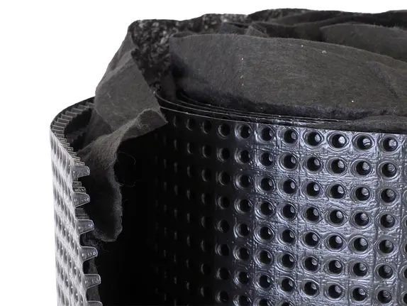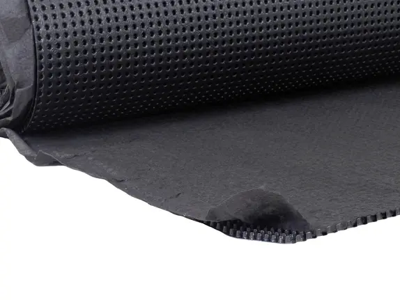 Polyflow® 10 is a sheet molded drain that establishes predetermined pathways for below-grade water management. It is ideal for residential projects and provides effective drainage for foundations, basements, and retaining walls. The fabric allows water to pass into the drain core while restricting the movement of soil particles which might clog the core. The core allows the water to flow to designated drainage exits. Polyflow 10 is designed for vertical applications and are suitable as protection layers for Polyguard waterproofing membranes.