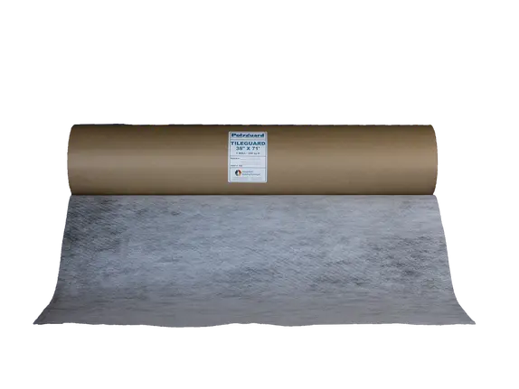 | Tileguard™ is a composite membrane of fabric and rubberized asphalt, 40 mils in thickness used to reduce the risk of cracking of ceramic tiles in a flooring application. This elastomeric, self-adhesive membrane is wound on cores with a disposable silicone release sheet. It absorbs stress caused by concrete cracking, helping to prevent cracks in the subfloor from appearing in the tile surface above. Tileguard™ can be installed over a variety of subflooring surfaces, including installation underneath ceramic or brick flooring with thin or thick tile setting materials. |