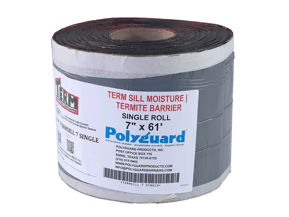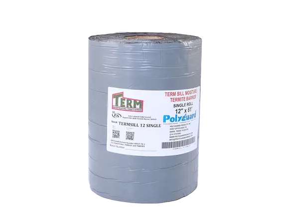TRM Sill is a "peel and stick" non-chemical termite barrier installed directly on concrete beneath the sill plate to block subterranean termite entry.